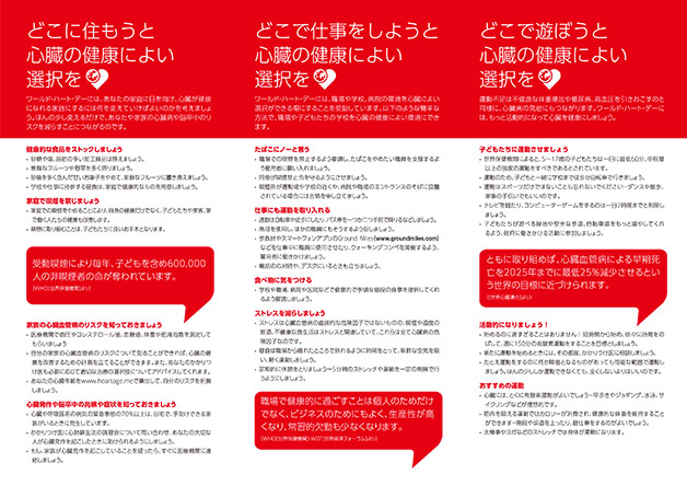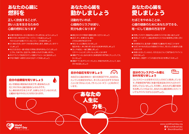 この「ワールド・ハート・デー」をきっかけにあなた自身や家族がいつまでも健康を保ち続けることかてき るよう、行動を起こしましょう。